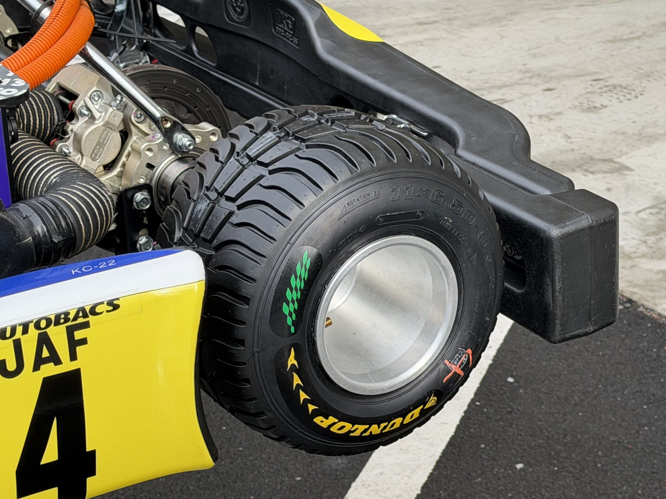 前日夜から降り出した雨がレース当日朝まで残り、路面はフルウェットコンディション。今シーズン初めて導入されることとなったレインタイヤは、性能を落とすことなく従来のレインタイヤから大幅にサステナブル原材料を高めたDUNLOP社が新たに開発したEVカート専用のレインタイヤ。