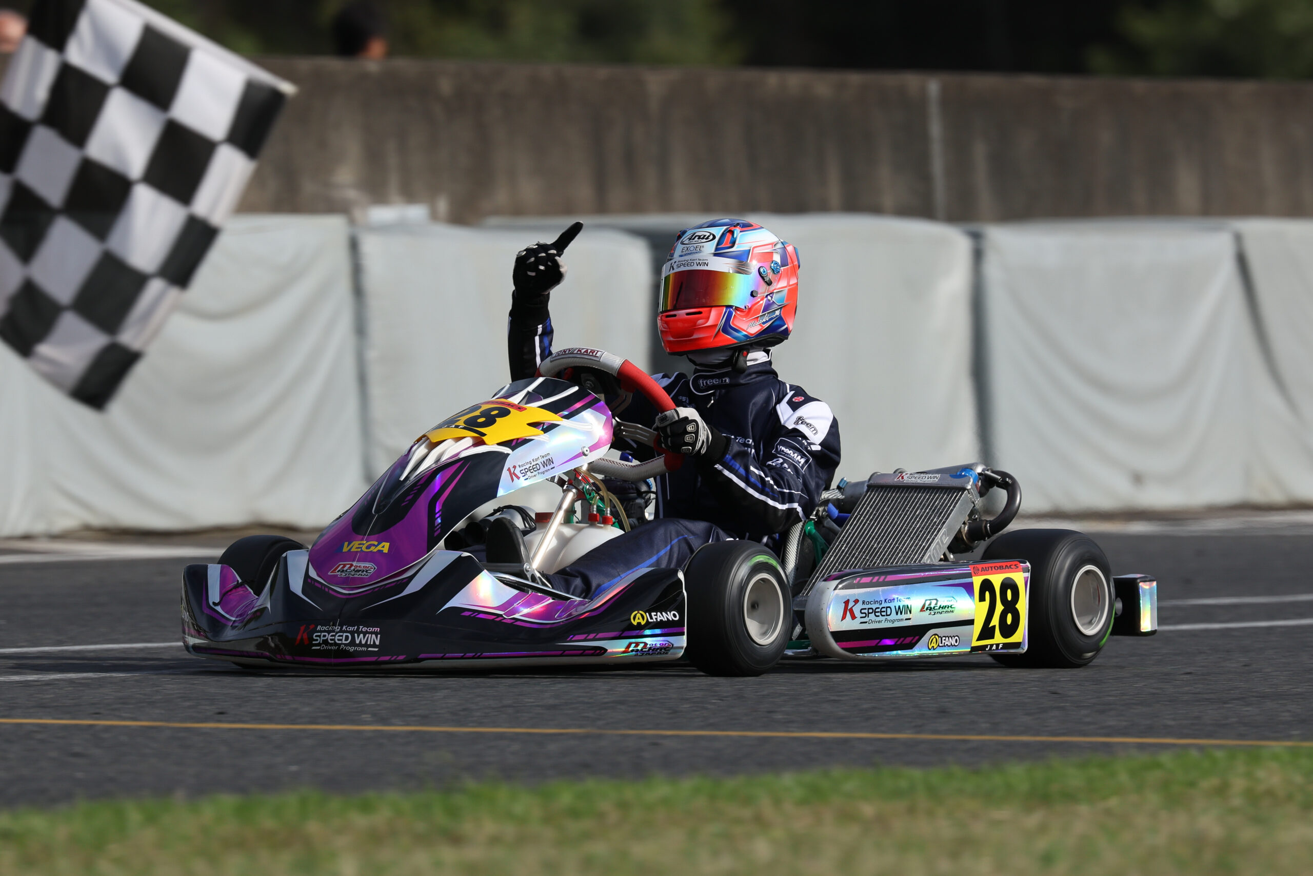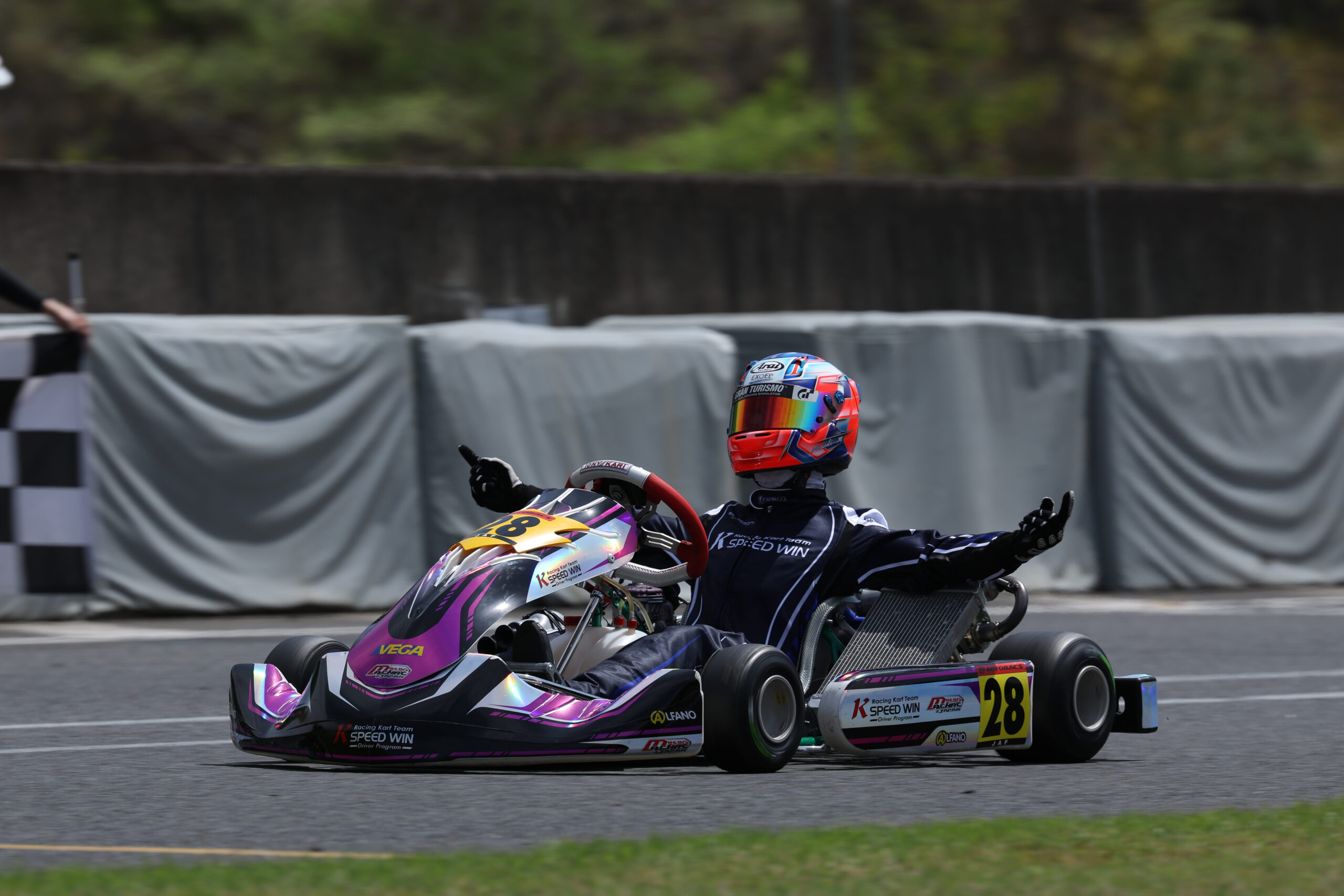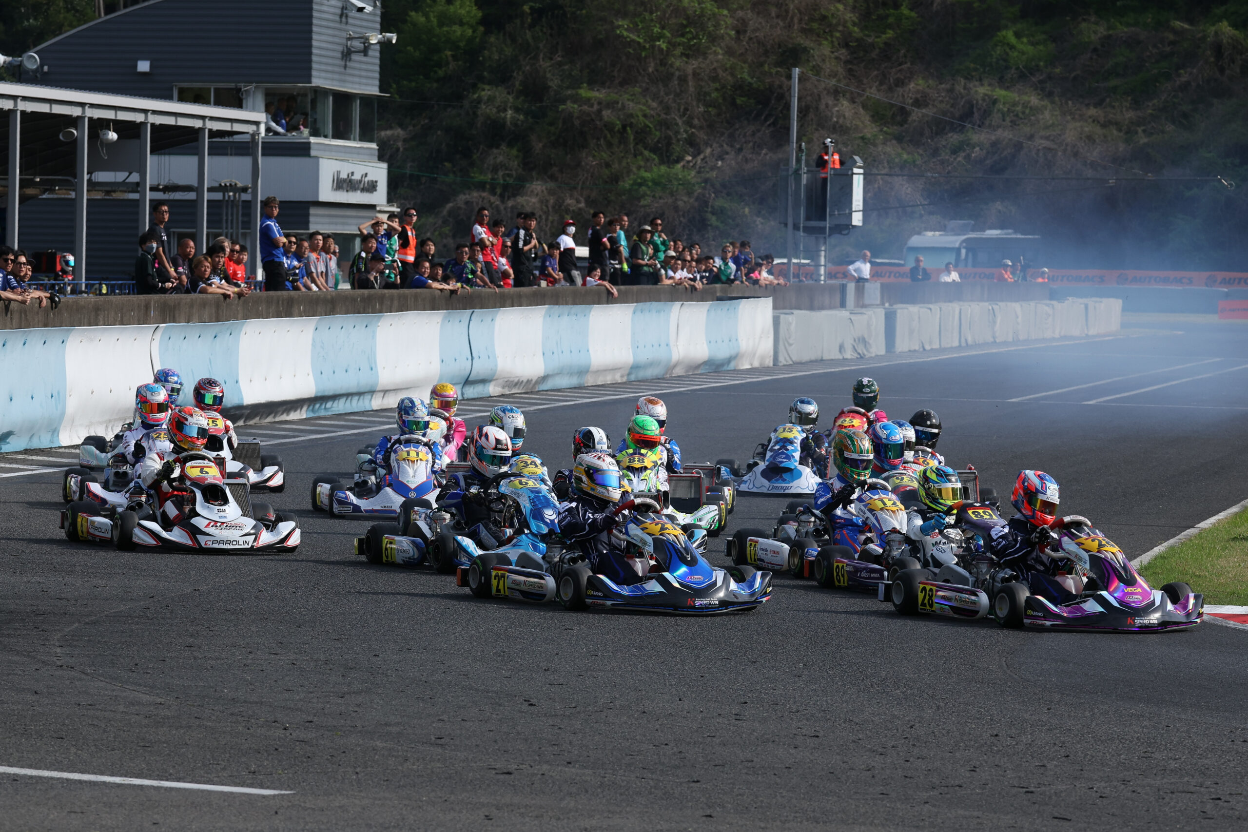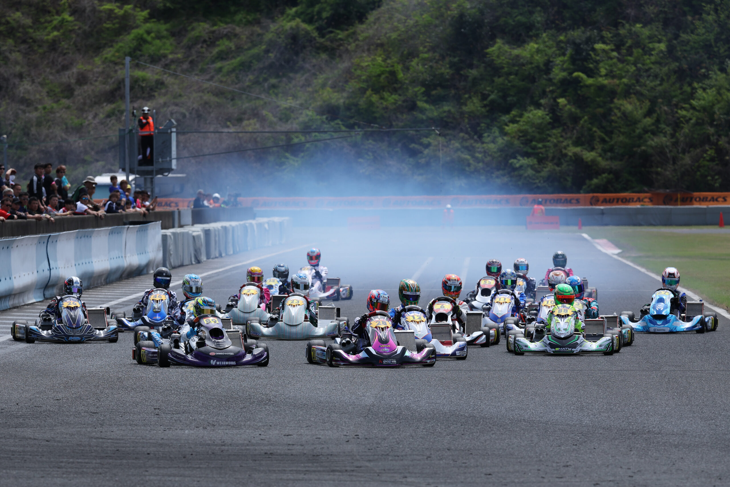 20台が集まったOKクラス。今季は有望なルーキーも多数参戦し、フレッシュな顔ぶれでのシーズンとなる。日曜朝に行われたタイムトライアルでは、ルーキーの横山輝翔(HIROTEX RACING)が全体トップでスーパーポールへ進出。以下、松居寿來(K.SPEED WIN)、國岡光貴(ガレージC)、三村壮太郎(PAROLIN JAPAN)、坂野太絃(TEAM EMATY)、元田心絆(YAMAHA MOTOR Formula Blue)、皆木駿輔(K.SPEED WIN Drago CORSE)、手塚大雅(Zi-ViVrre RT)の8人がスーパーポールへと進出した。スーパーポールでは松居がトップタイムをマークし、第1戦の決勝PPを獲得した。第1戦決勝、好スタートを見せたのはPPの松居。それを元田、皆木、横山らが追っていく。松居は、トップをキープしながら前半から中盤までラップリーダーを記録し続け、安定した走行を続けていく。次第に2番手元田との間隔も開いていき、独走体制を固めていく。終盤に入ると、ピットクルーからは次のレースへ向けペースダウンの指示付が出されるほどの一方的な展開となり、松居は指示にしたいがペースを落としたものの、それでも後続が追いつくことはなく、独走のままチェッカー。全日本最高峰クラスでデビューウィンを飾った。