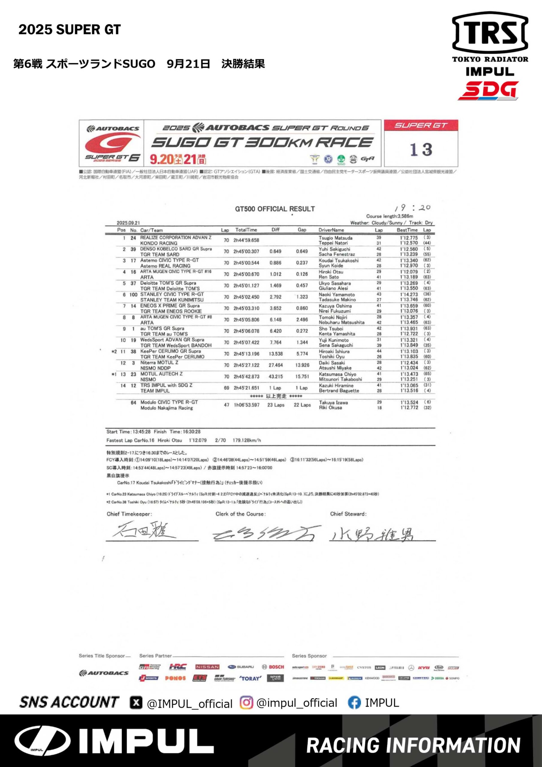 本日は、9/20〜9/21に開催された2025SUPER GT Rd.6 スポーツランド菅生大会についてご報告いたします。